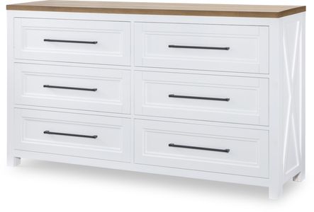 Harvest Oak tops on quartered white oak veneer sit atop Natural White painted bases. Select items offered in Aged Black that repeats the finish on hardware and accents.