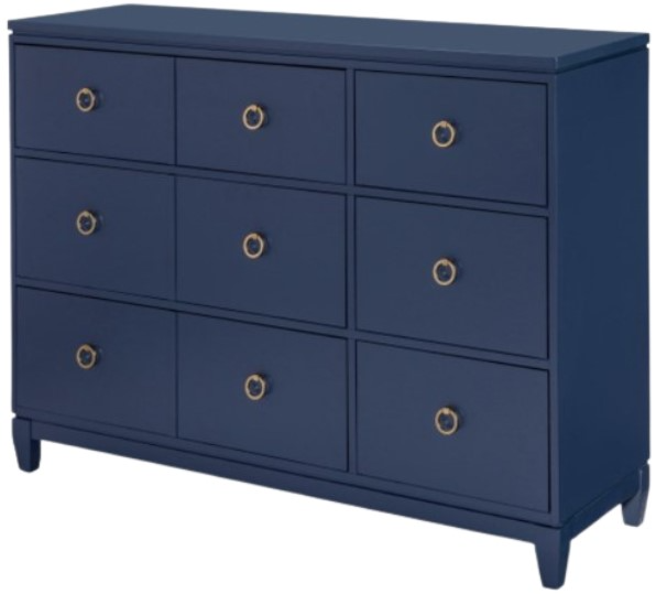 Gold ring pulls and knob hardware adds a high-end touch. Clean, casual, and versatile. Fresh designs combine with an alluring inkwell blue finish to create the Summerland collection.