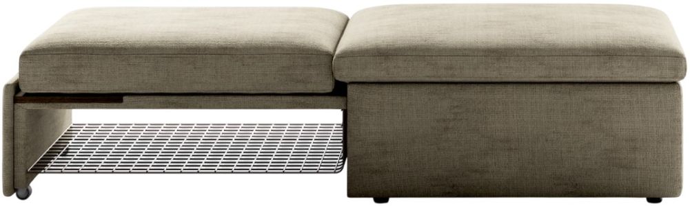 The convertible ottoman sleeper provides versatile solutions for modern living, featuring an integrated coffee table surface and mattress section storage.