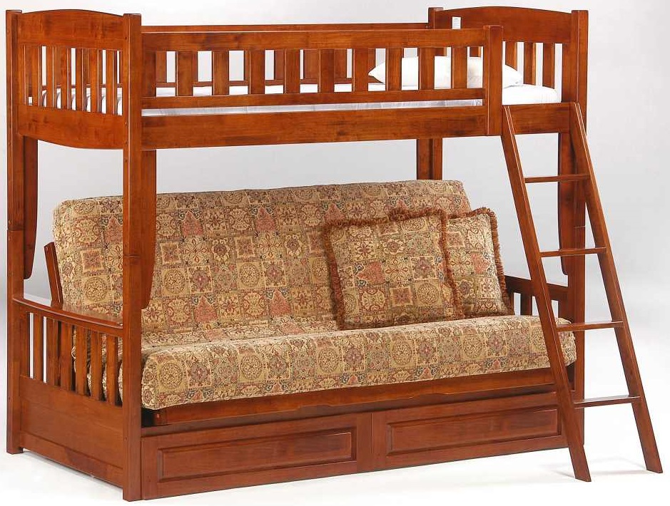 The Cinnamon Futon Bunk is a most remarkable and versatile space saver. With a twin bed above and a full size futon below you have instant sleep-overs with a quick conversion of the bottom futon. Leave it up as a sofa for lounging, reading, playing and general creative day dreaming. The Cinnamon Futon Bunk gives you all the comfort, style and quality you expect from a Night and Day Furniture product. Bunk Beds are notorious for cheap construction – but not ours! Our handsome Cinnamon Futon Bunk maintains all our top construction and finishing standards, while remaining a great competitive value. Will accommodate Futon Collection Storage drawers below. The Cinnamon Futon Bunk uses our Shoe Fittings Gold front operating system. All Spices Bedroom Collection items come with a limited 10 year warranty; see local store for full details.