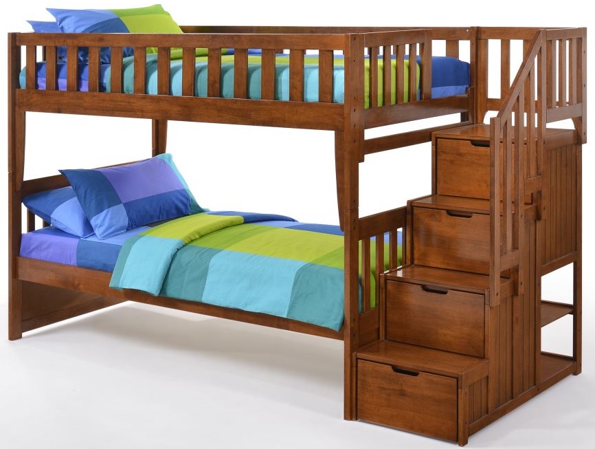 The Peppermint bunk is fun, comfortable and has space for nearly everything. It’s got stairs & railings with drawers in every step! Note the surprise extra shelves at the back too. Go all the way and add Rolling Storage Drawers or a Trundle Bed. Not least, the stairs are switchable, assemble them at either end. Our Spices Bunk Beds give you all the comfort, style and quality you expect from a Night and Day Furniture product. Our bunks feature all our best construction and finishing standards while remaining a great competitive value.
