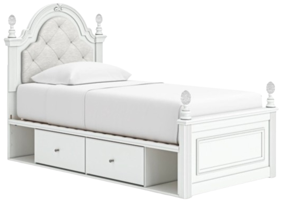 Fit for a princess. This twin upholstered panel storage bed’s crisp matte white finish pairs with charming ornate beading and sumptuous button-tufted upholstery—perfect for your girly girl. Spacious storage drawers neatly tuck away bedroom essentials. Decorative ball tops and multicolored LED lighting in the headboard are the crowning touches to make your little one feel like royalty.Read More
